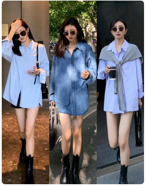 除了适合自己的衬衫,偏大码的男士衬衫也可以在小姐姐身上搭配出彩。采用下衣失踪的穿法,搭配短靴能够秀出自己修长的腿部线条。简单的宽大衬衫上面也可以搭配一些小饰品,例如丝巾和披肩,能够减少单调。