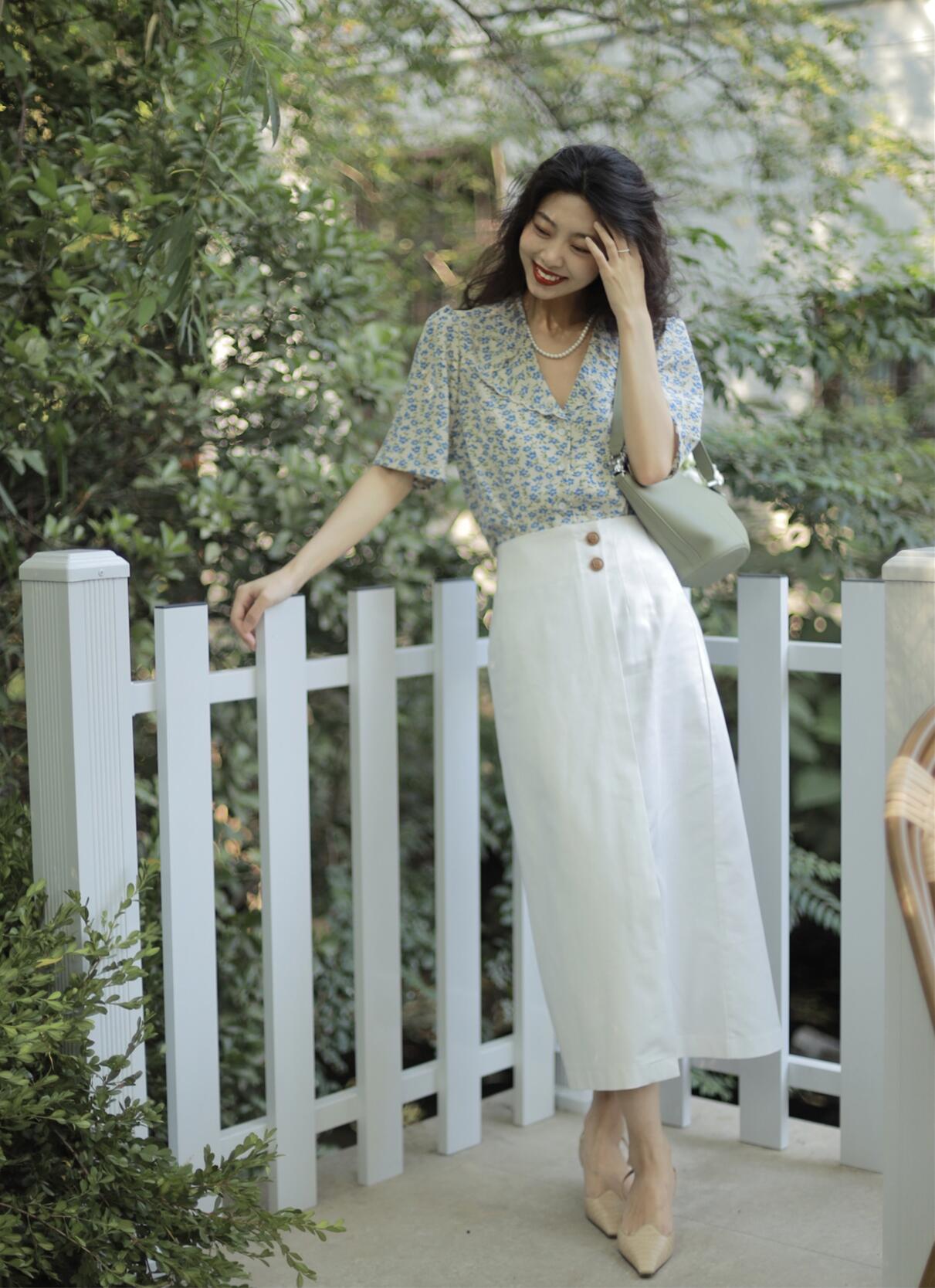 这时候我们就可以学习上图这位穿搭博主的思路,将衣角的一边塞入裙子,或者是在一边系上小结,同样也能露出腰线,打造“上短下长”。