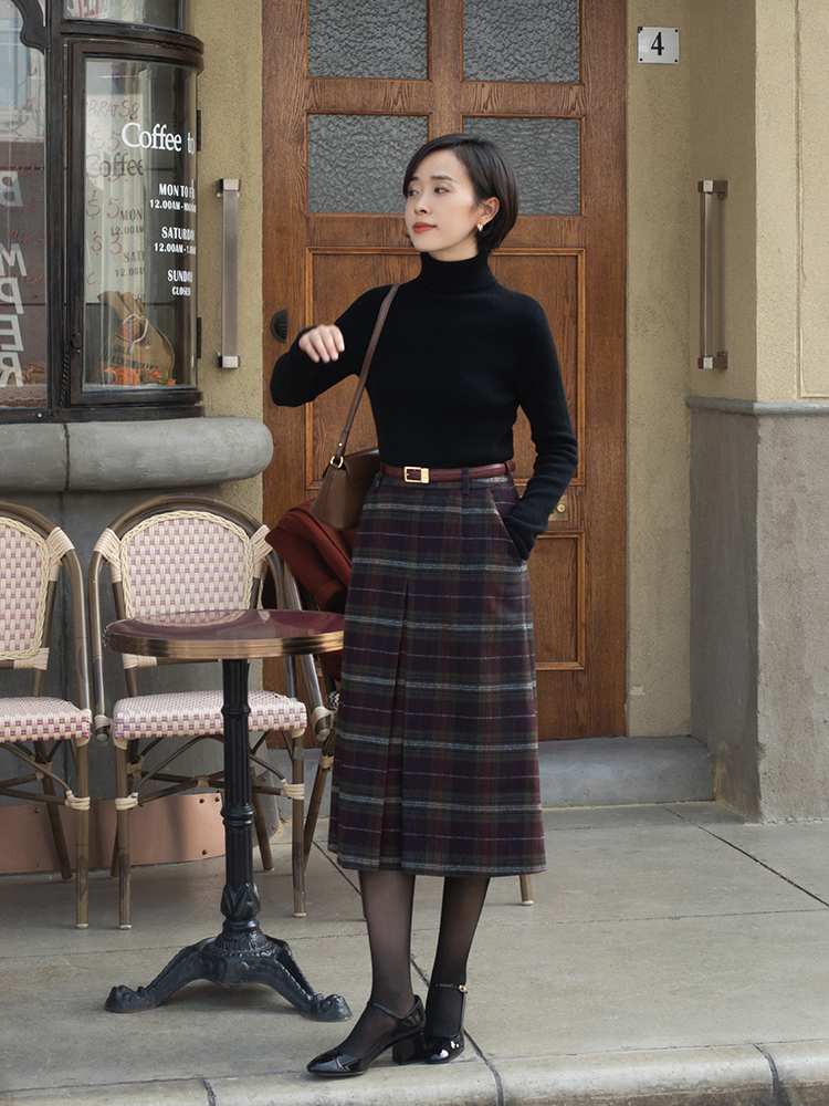 像下面这位博主就选择了黑色的针织打底衫搭配高腰格纹半身裙,用这一身复古且时尚的穿搭营造出了满满的高级感,也更好地增强了她的气场,而且简繁结合的搭配方式可以帮助我们调节身材。