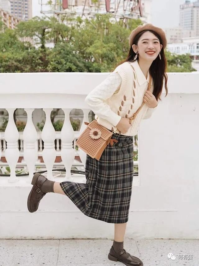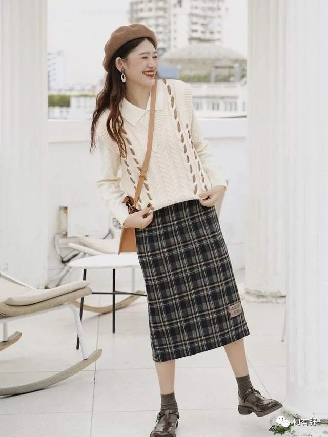 在搭配下装时,大家可以借鉴“繁简结合”的原则,为自己搭配一条深色系的格纹半身裙,这样它与上身中的白色就能形成很鲜明的对比,明暗交织,反而会让你看起来更惹眼。