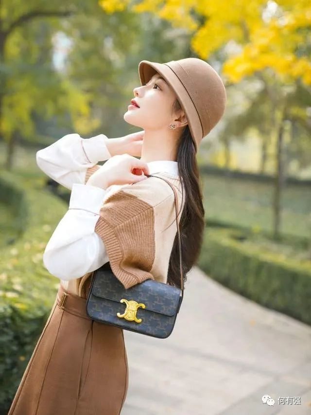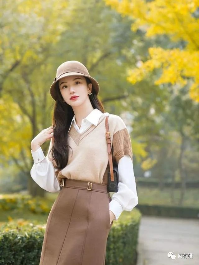 博主在搭配时,借鉴了“反季节穿搭法”,还巧妙地融入了“塞腰穿法”,她搭配了一条驼色的半身裙,还将毛衣与衬衫的衣摆塞进了腰身里,这就能起到明确腰线的作用,还会勾勒出你纤细柔软的腰肢。