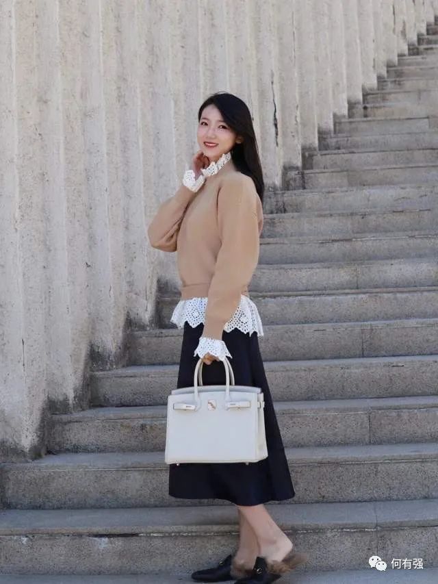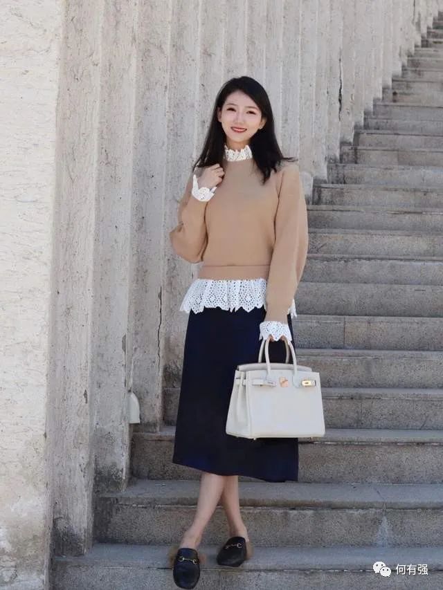 但博主很巧妙地搭配了一件白色的镂空上衣作为内搭,而且这件上衣的领口、袖口、衣摆都从毛衣的这三个部位中露了出来,这就能打造出非常丰富的层次,大大提升了设计度。