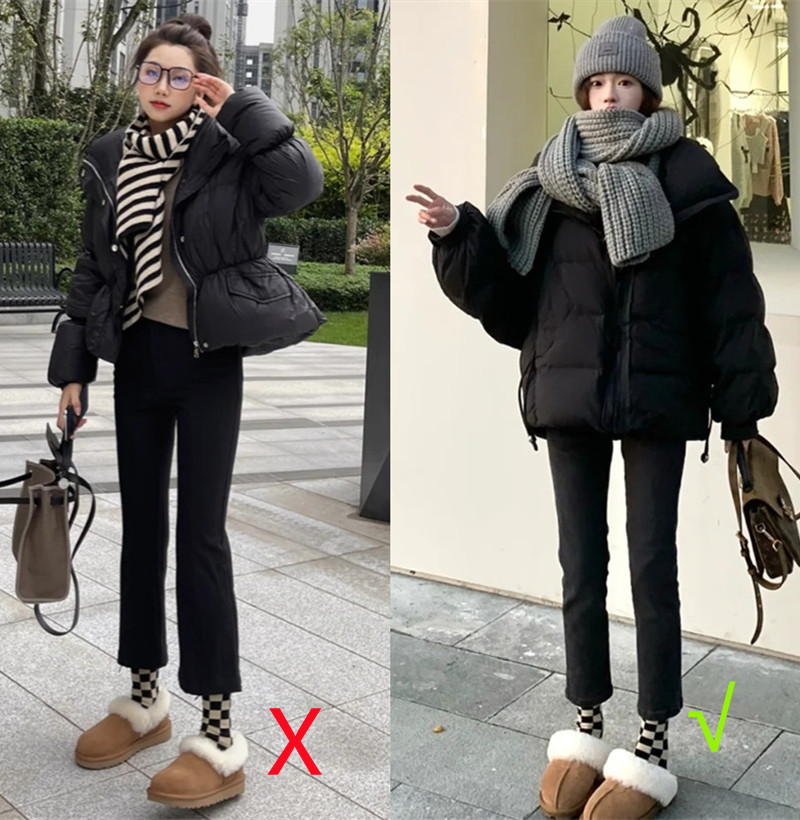 右图选择的是白色羽绒服,内搭修身打底衫,而下半身则是修身小黑裤,在视觉上起到了显瘦、显高的既视感。