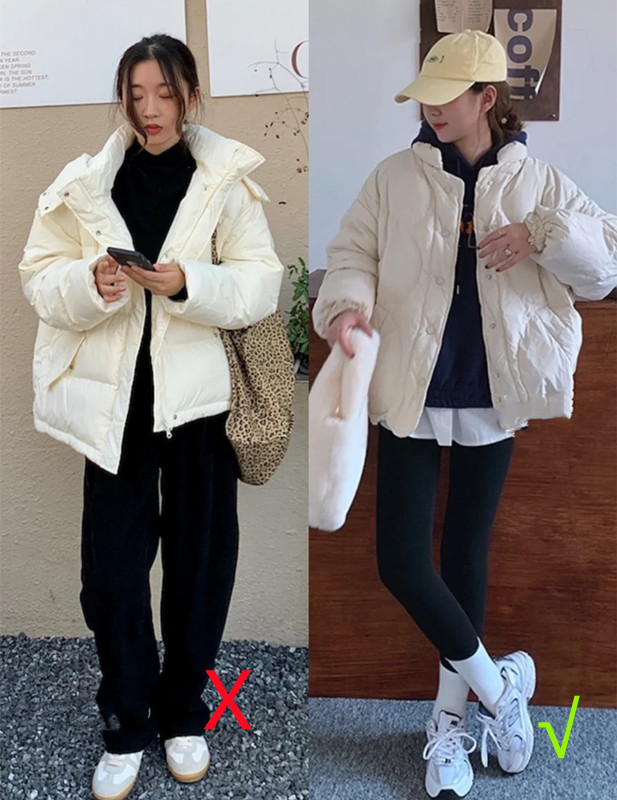 左图就是“内松外松”的搭配方式,使得自身出现臃肿、松垮的情况。而右图则是“外松内紧”的搭配方式,遮肉又显瘦。我们在穿着羽绒服时,就可以采取这样的搭配方式哦。这样一来,不管是穿着白色羽绒服还是黑色羽绒服,都可以起到显瘦的效果。