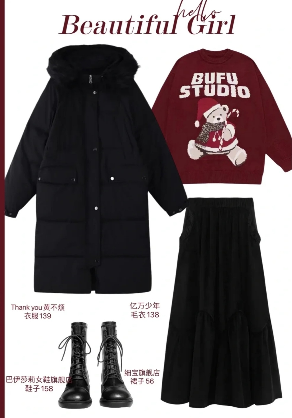 这一套可以说是比较经典的穿搭方法了,毛衣+半身裙+外套,颜色也是常见的黑配红,很时尚的一款穿搭,裙子如果长了可以在腰上卷两圈,不挑身材不挑身高的一款。