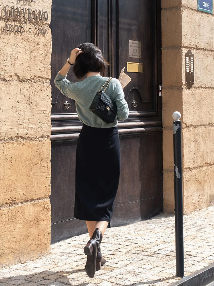 博主选择的是一条藏蓝色的半身裙,这个颜色偏黑色,但是在阳光下看,与黑色又有细微的区别,所以非常有高级的质感,如果你的肤色不够白皙,可以利用它来改善,点缀两个金属纽扣后,会更有英伦风的气质。
