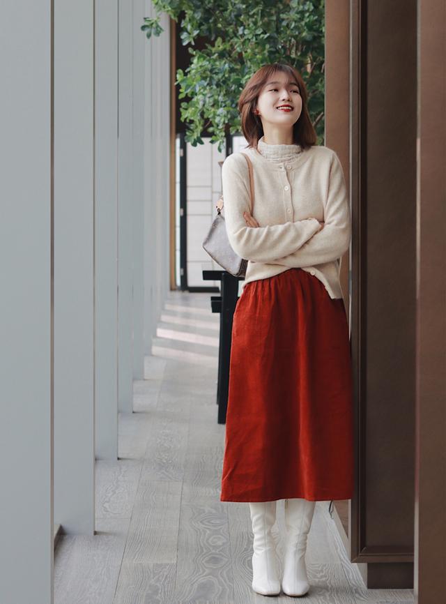 要想穿出超高回头率,不妨借鉴下图中的穿法,用红色半身裙搭配白色中筒靴,在营造视觉冲击感的同时提亮造型,十分抓人眼球。除此之外,还可以尝试一下其他高饱和度的颜色,像是墨绿色半身裙加白色中筒靴、姜黄色半身裙加白色中筒靴等,都是回头率超高的穿法哦!