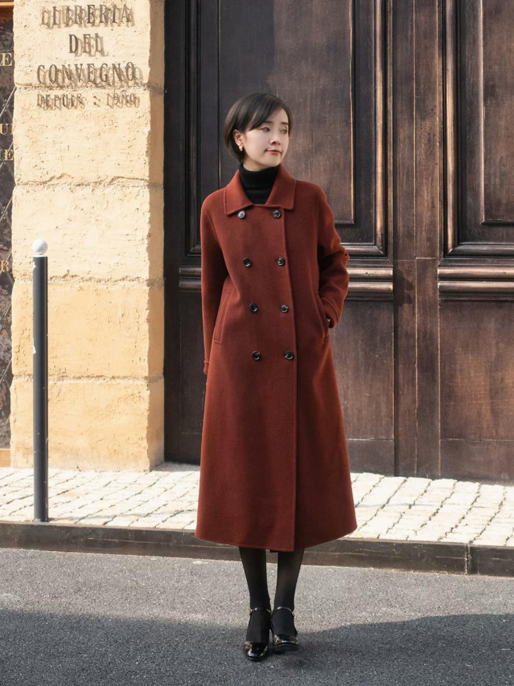 为你推荐的第三款是一件红色大衣,它并不是正红色的款式,而是融入了黑色调的暗红色,所以看起来很有复古风的气质,是百搭不挑人的款式,如果你的肤色比较黑,那么就可以利用它来起到显白的作用。