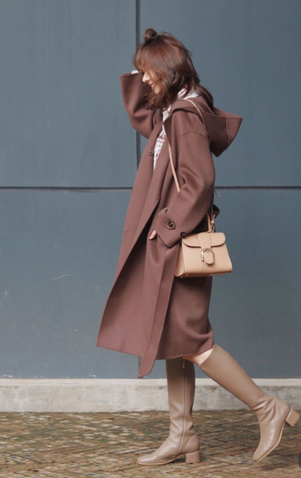 这个博主搭配的连帽大衣很时髦,内搭衬衫和针织衫。这种叠穿搭配精髓就在于不可以太厚重,针织衫材质可以轻盈一些,而且结合v领的设计也能修饰你们的上半身曲线,拉伸你的脖子,看起来非常时髦,显瘦的效果还是挺不错的。