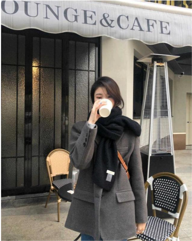 这款围巾的佩戴方式比较有年代感,特别有爷爷奶奶那一辈的感觉,我们可以先把围巾对折挂在脖子上,然后把围巾两端从对折的中心点穿过掏出,就OK了。用它和廓形大衣同时出现的,简约又有韩剧女主的轻奢范。