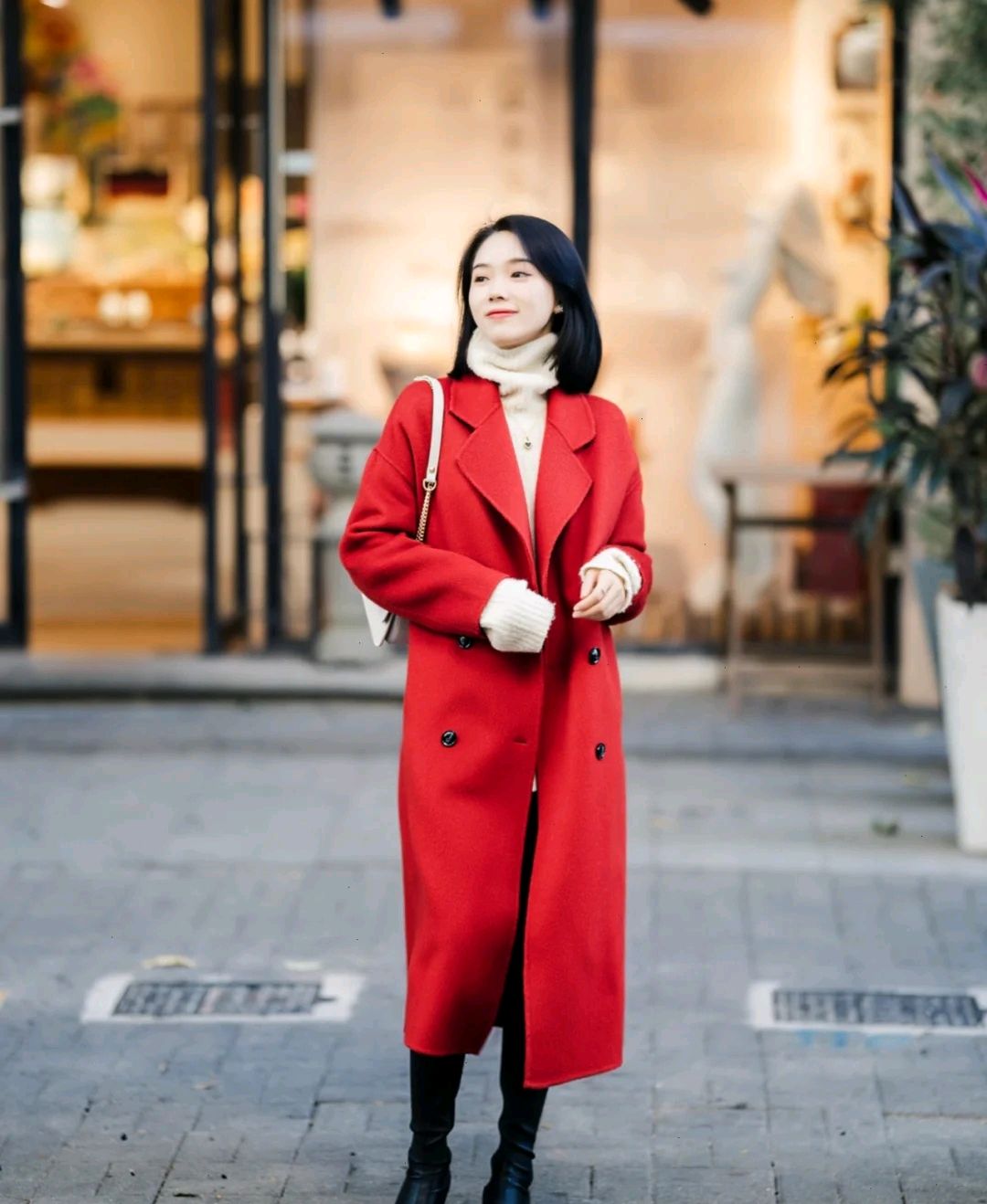 有的女生为了穿衣显瘦,会优先选择黑色大衣来穿,穿搭思维没有错,但如果不会搭配的话,看上去就会很沉闷,甚至会显得很老气,所以我们要换一个穿搭思维,可以选择比较有活力的服装颜色来穿,比如说红色大衣穿搭。