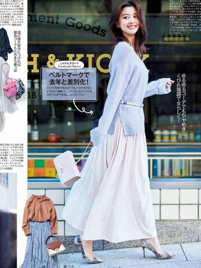 第二点就是使用开叉设计的半身裙,减弱搭配中的包裹感;最后,最重要的一点就是在此基础上添加一款腰带,收腰的同时还能打造高腰线,穿出显高又精致的效果。