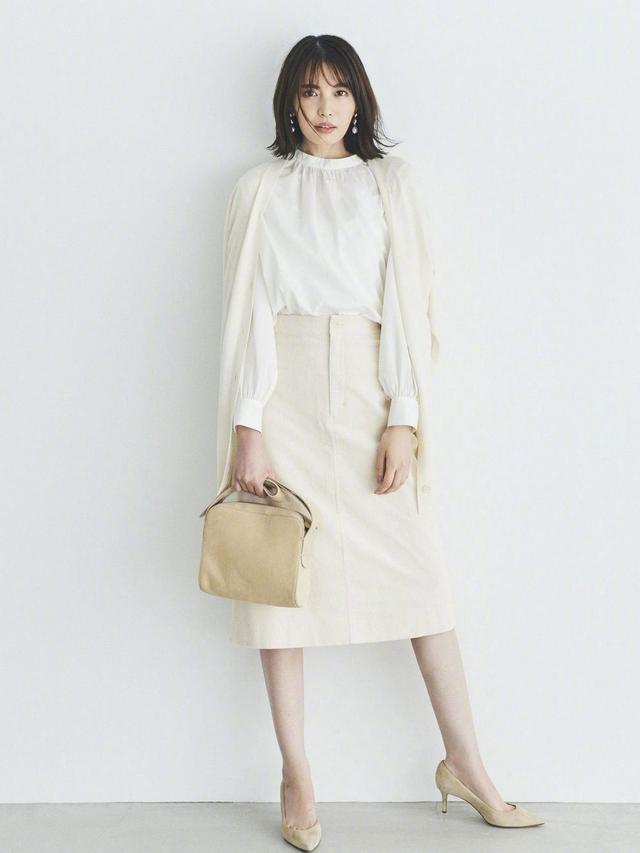 不知道从哪下手的女性,可以试试下图博主的穿搭,浅黄色西装+白色衬衫+浅黄色半身裙+黄色高跟鞋搭起来既温柔又优雅,配上一对珍珠耳坠贵气感十足。