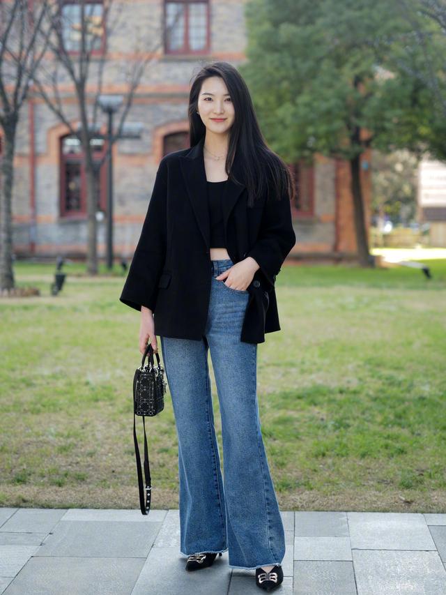 小个子姐妹在穿“短大衣+喇叭裤”时,还可以有意地把造型重点放在上半身。比如像上图博主的穿搭,就完美地利用了“留白”来引导别人视线上移。