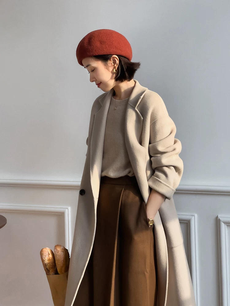 首先为大家介绍的是一件杏白色的大衣,这个颜色偏向于白色,但多了几分温度,所以会在视觉上起到升温的作用,还会打破纯白的苍白生冷,为冬季注入几分温度,是黄黑皮美眉可以放心选择的浅色,明亮动人、简洁大气。