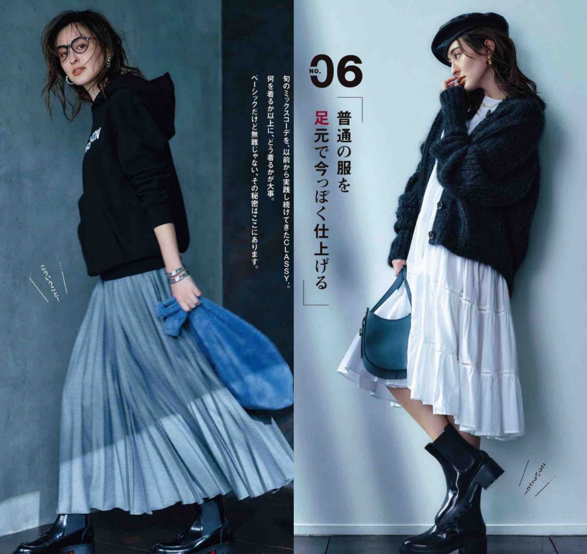 短衬衣或者是毛衣的搭配当中,下半身利用高腰黑色半裙形成上短下长的视觉效果,特别凸显身材比例。烟管靴相比于马丁靴靴口更加紧一些,更容易塑造纤细的脚踝和长腿,对于个子比较矮小的女生来说也很友好。
