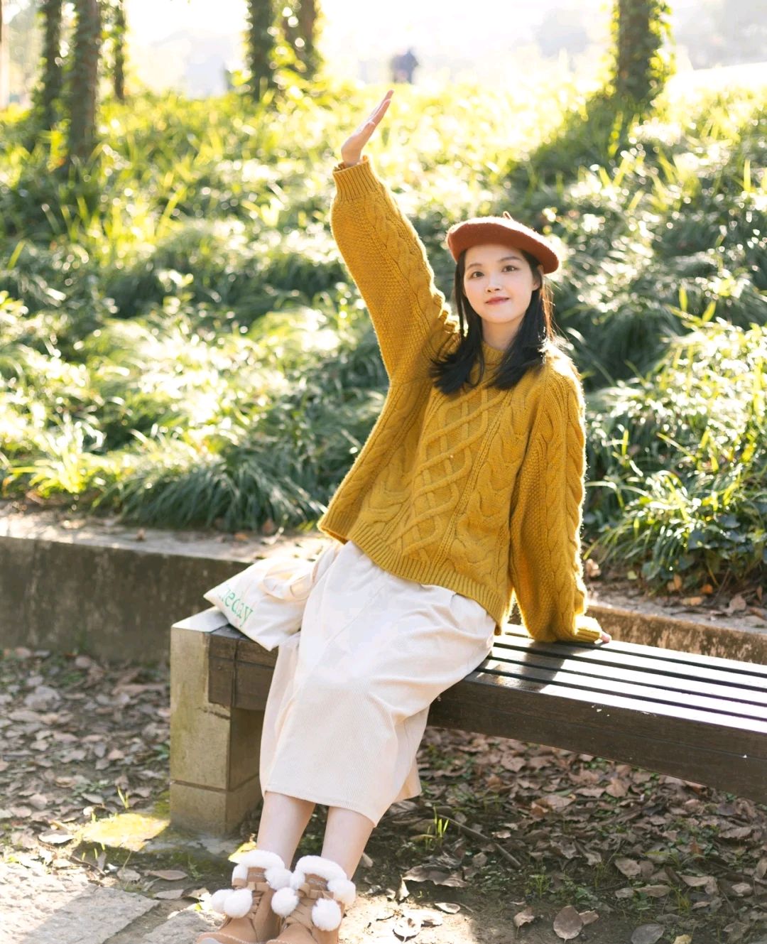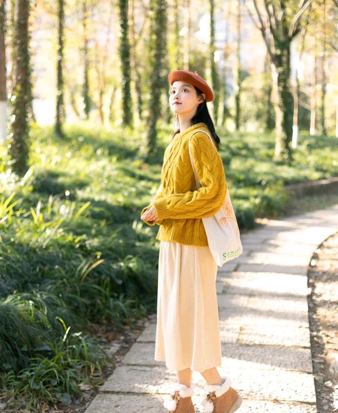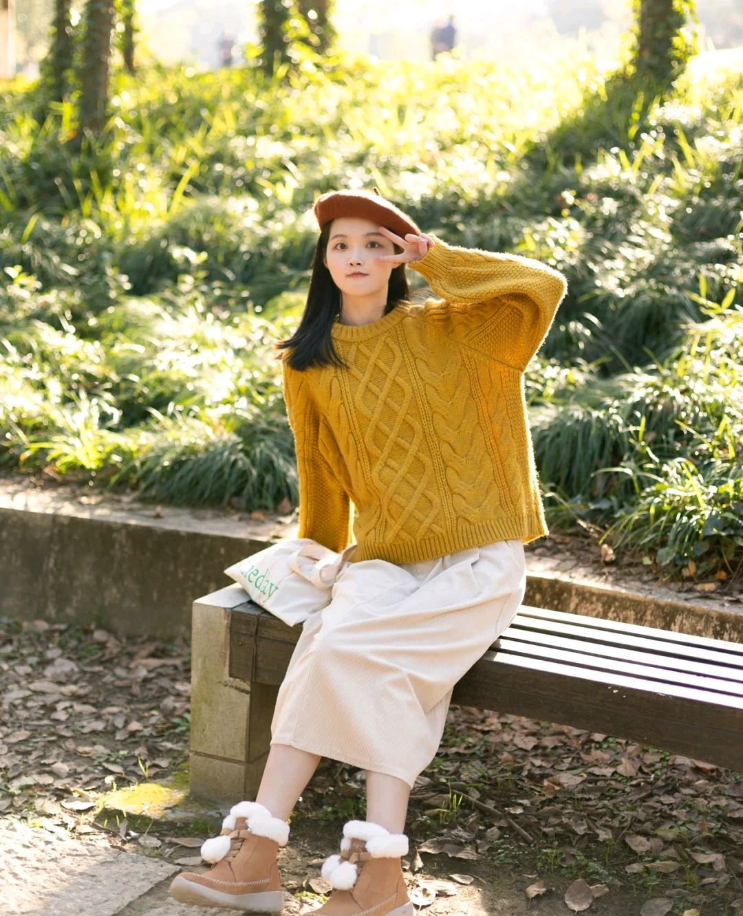 二、黄色毛衣+白色半身裙