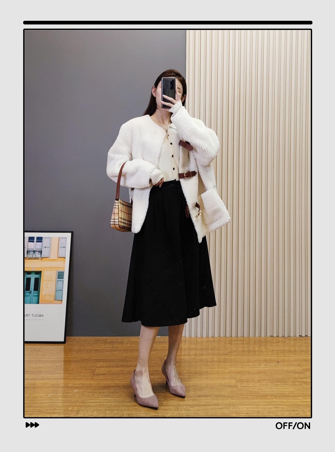 这件简约休闲的短款羊羔毛外套,非常适合搭配一条高腰直筒裙,视觉上除了显瘦,还能优化身材比例。