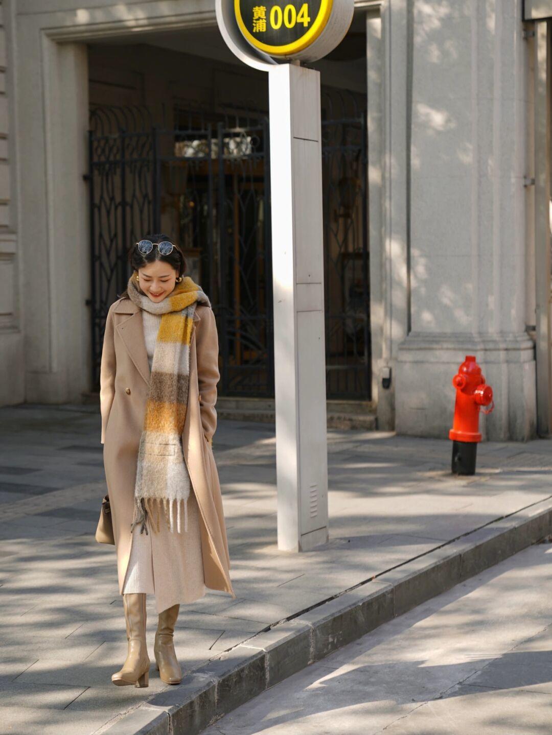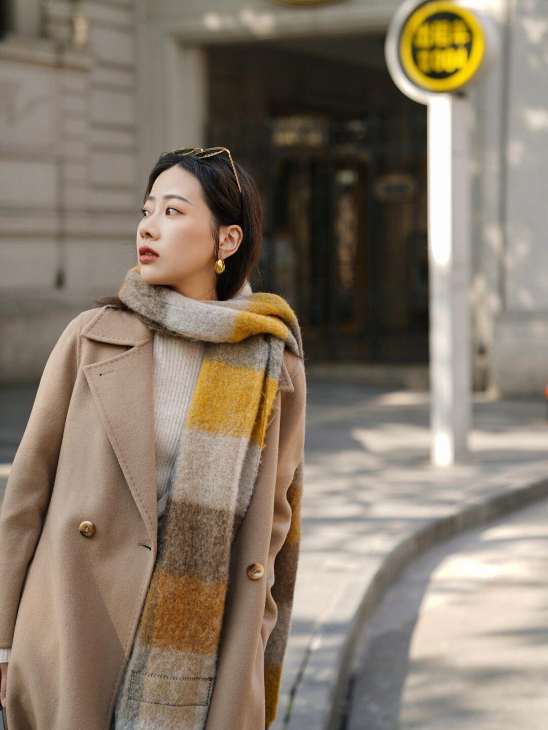 首先为你介绍的是一件杏色的大衣,这个颜色很独特,与白色相近,与驼色又有一定的区别,是很值得大家去尝试的高级配色,如果你是黄黑皮,可以自信的去试一试,它并不会太难驾驭,反而会衬的你更加容光焕发。