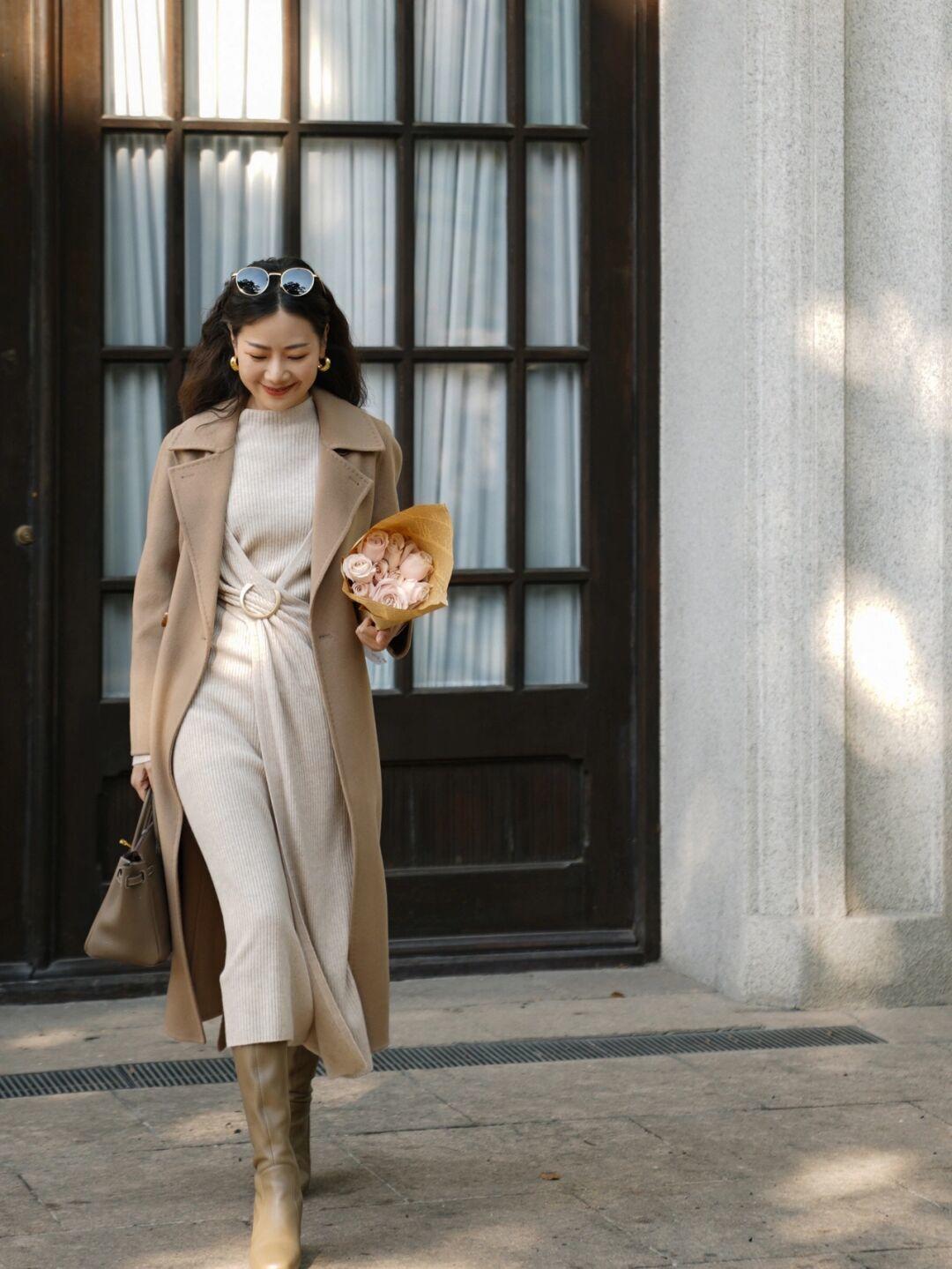 为了展现女人味,博主挑选了一条白色的针织连衣裙作为内搭,这是非常实用的细节,毕竟在冬季单穿裙装难免会觉得冷,与大衣叠穿的话就非常保暖了,还会注入优雅女人味,博主选择了一条修身性强的连衣裙,这就能隐隐约约勾勒出穿搭者玲珑有致的窈窕曲线。