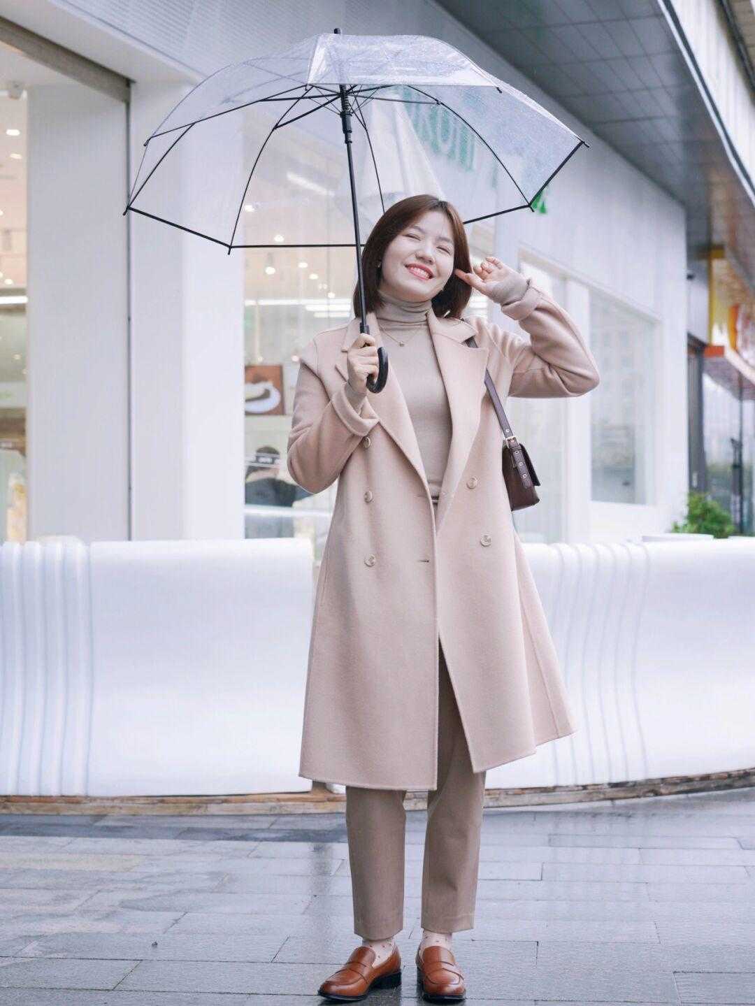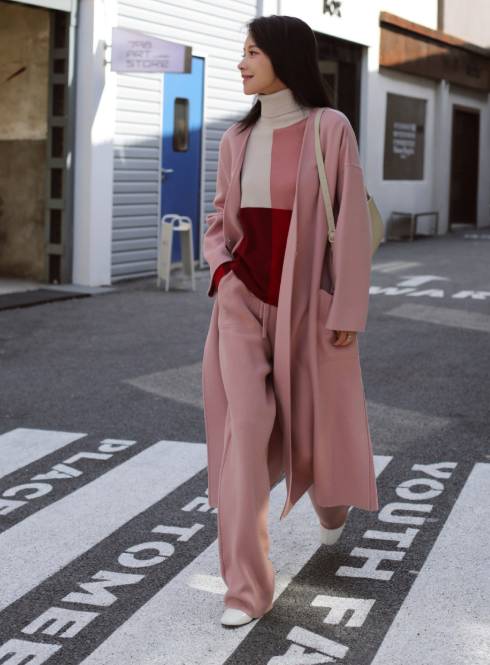 奔三奔四的女性不要惧怕这类粉色的服饰,不会导致尴尬感,也不会导致厚重感,比如我们可以选择轻薄的高领内搭,这样穿是很轻盈的,下面的博主就选择了高领衫,看起来很温柔,搭配的粉色大衣也很简约知性,日常搭配都很ok。