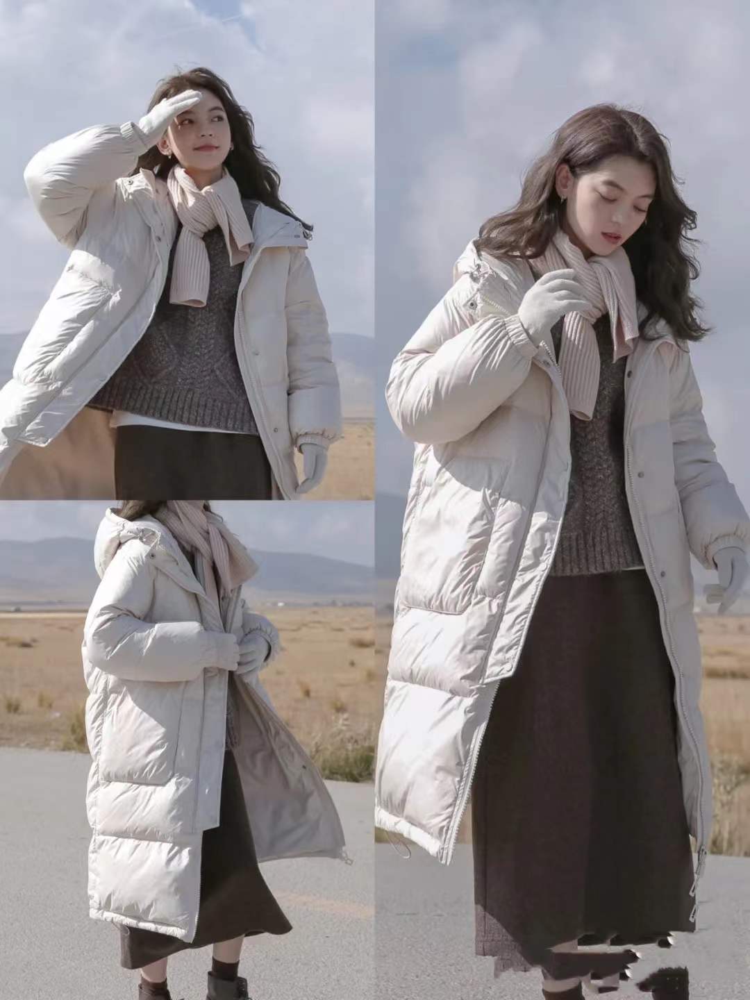 米白色的羽绒服,米色系的毛衣以及半身裙,组合起来非常地温柔大方。