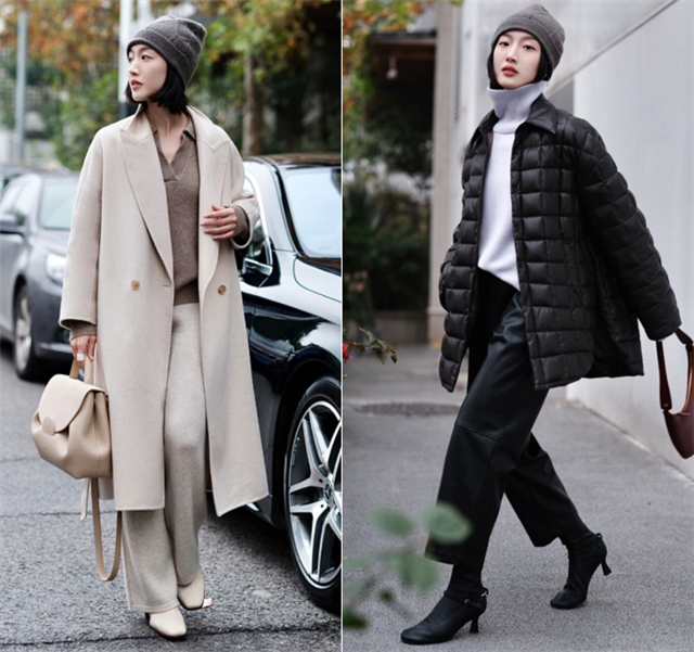 针织衫也是冬季不可或缺的服饰,可以单穿还可以叠穿,叠穿的话可以尝试结合羽绒服或者是大衣,都可以展现出满满的层次感,比如下面的博主选择纯色修身针织衫,可以显示出温柔知性的韵味,再结合阔腿裤也可以修饰比例。