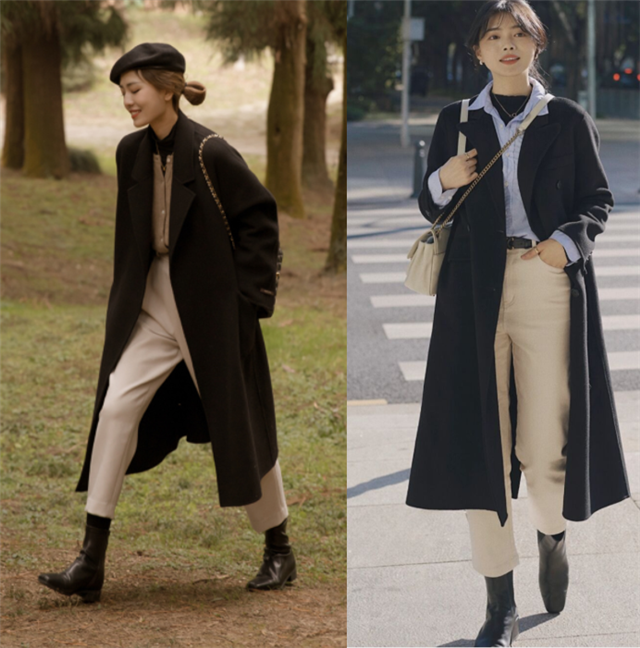 冬季穿大衣,搭配阔腿裤肯定是很时髦的,毕竟阔腿裤和宽松的大衣可以显示出潇洒的魅力,让你的气场大大增强。在搭配的时候,也可以参考下面的黑白配,黑色大衣和白色的阔腿裤结合起来还蛮时髦的,顺便搭配短靴,也可以增高显瘦哦。