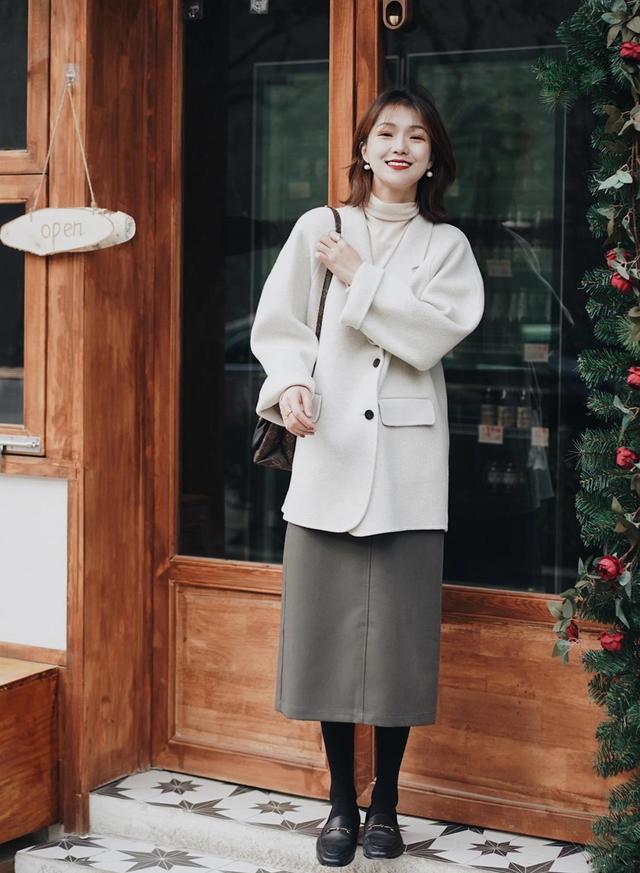 冬季在选择这组搭配时,我们最先要考虑的就是两者的材质是否能满足保暖的需求。像是春夏季节常见的薄款西装,拿到冬季来说就有些不合时宜了。更推荐你们试试用材质相对厚实一些的毛呢西装,搭配皮质半裙、针织半裙或是毛呢半裙。