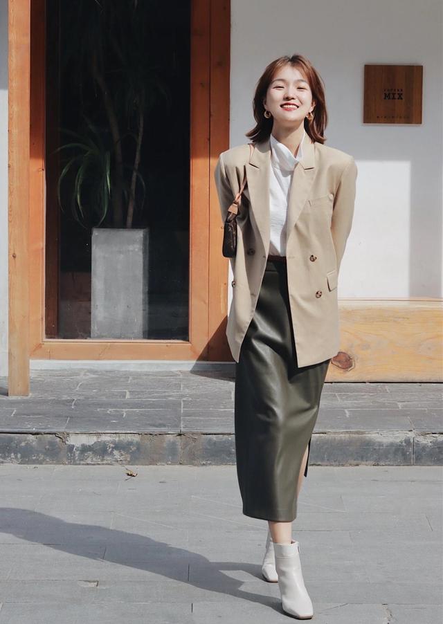 毛呢西装结合了高级的质感与西装的干练,能满足你的温度、气质双重需求。而这几款裙装的材质也比较保暖,且不同材质的风格也大不相同,像皮裙与西装的搭配就比较有娘Man风的效果。