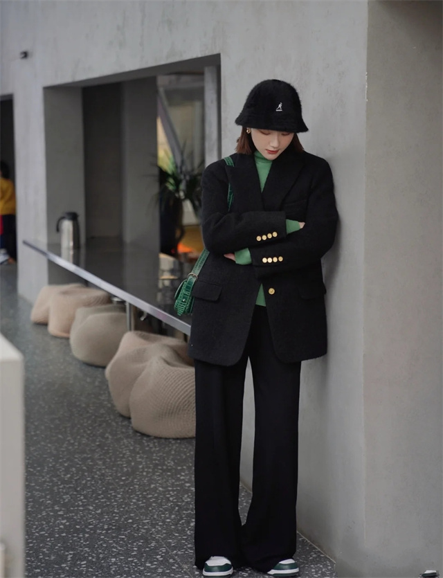 采用西装剪裁的中长款大衣挺括有型,非常适合身材微胖的女生穿。大衣和黑色阔腿裤形成同色系搭配,胖妹妹也能穿出纸片人身材。