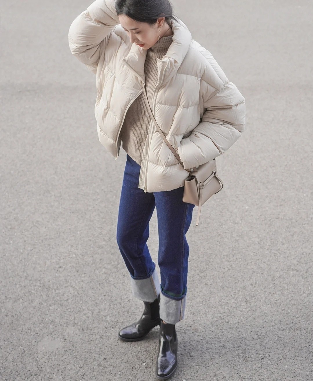 短款羽绒服和长款裤装之间的匹配,可以通过不同宽度的裤装来使造型变得更完整。像这款牛仔裤,它看起来过于休闲,但只要在鞋子的运用上保持一点正式感,就很适合成熟女性采用。这位女士采取的是保暖的黑色靴子,它的表面很有光泽感,虽然是黑色,但不会很沉闷。