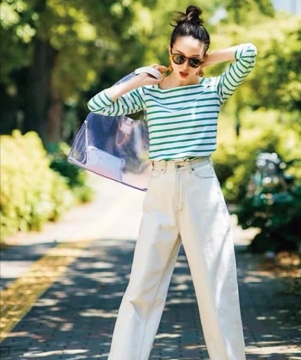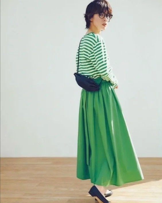运用条纹上衣配合长裤,有活力又会显得休闲一些,如果换成绿色的半身裙,那么色调之间就会变得更加统一,裙摆带来的优雅氛围不容忽视。