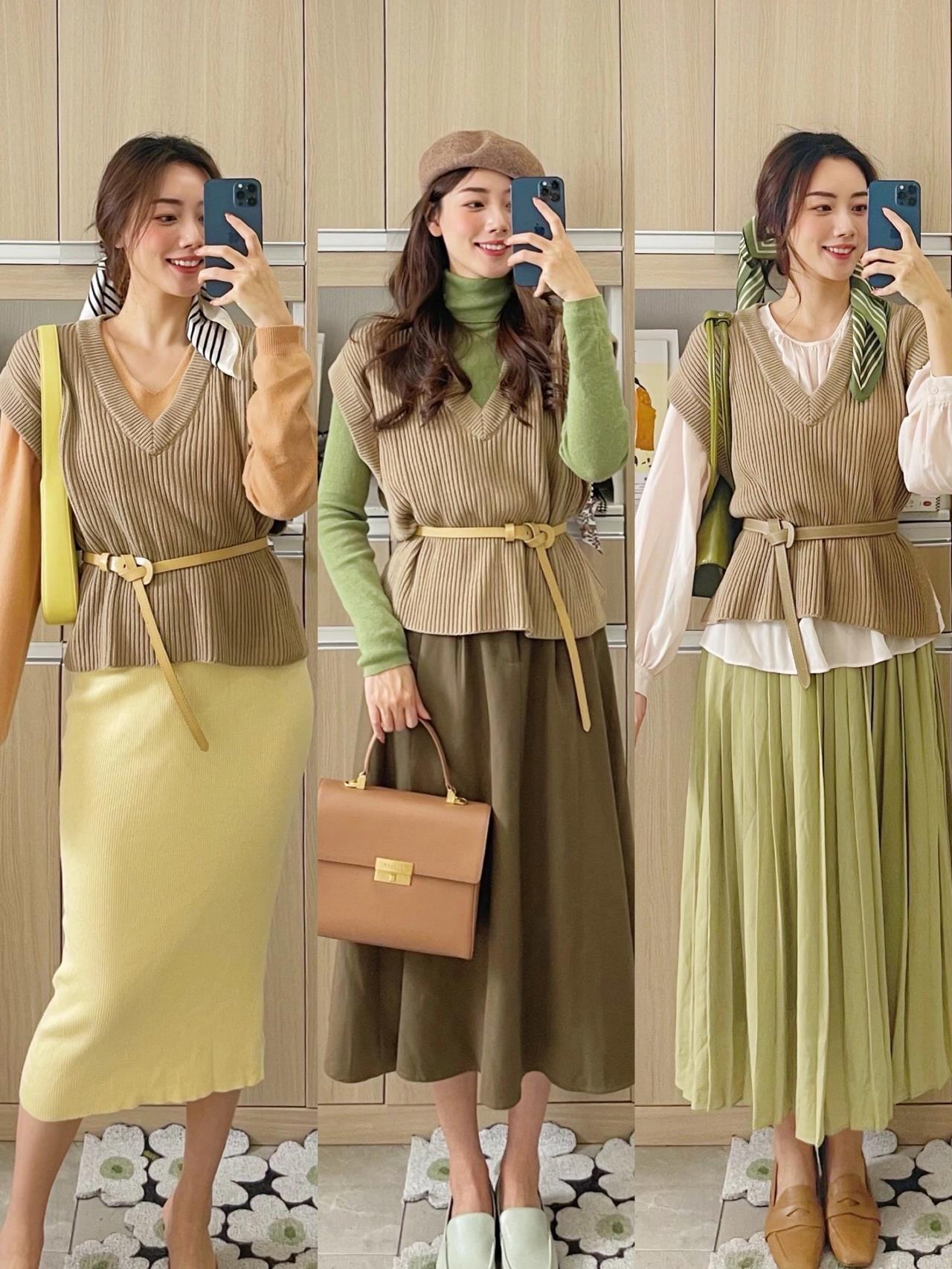 要想穿出让人眼前一亮的效果,我们在上衣和半身裙的颜色搭配上也得多加注意。在这个早春时节,我们不妨尝试一下鲜亮一些的配色,例如下图中的这种糖果色与大地色的组合就是很不错的选择。用糖果色增添活力感,大地色降低过于跳脱的效果,整体呈现出来的视觉感会更加减龄显年轻,很适合30岁女人做“轻熟风”穿搭。