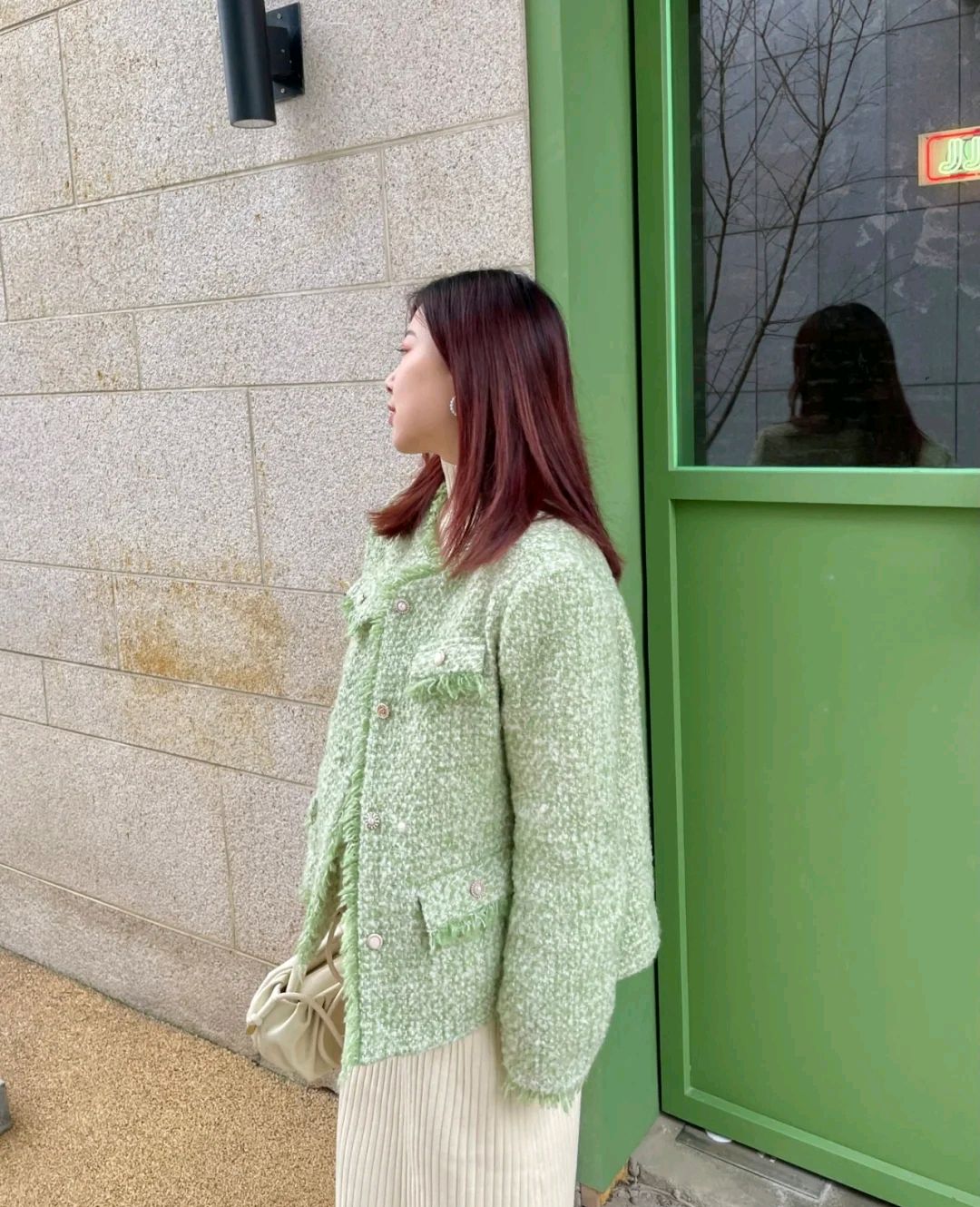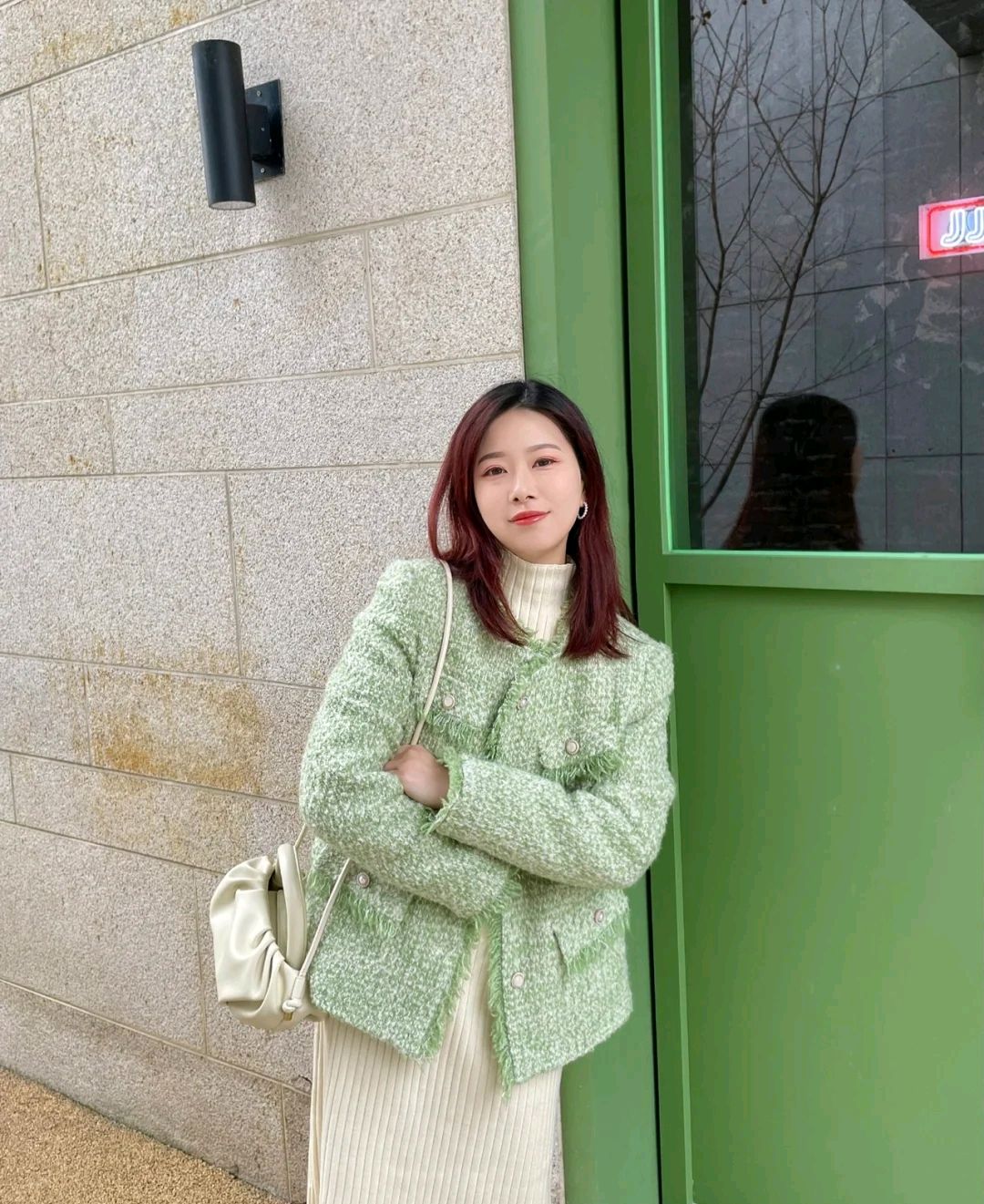 再加上这位时尚博主很注重穿搭细节,这身穿搭除了米白色就是浅绿色,哪怕是小小的袜子,也是以浅绿色为主,和身上的小香风外套起到了相互呼应的效果,看上去特别精致。