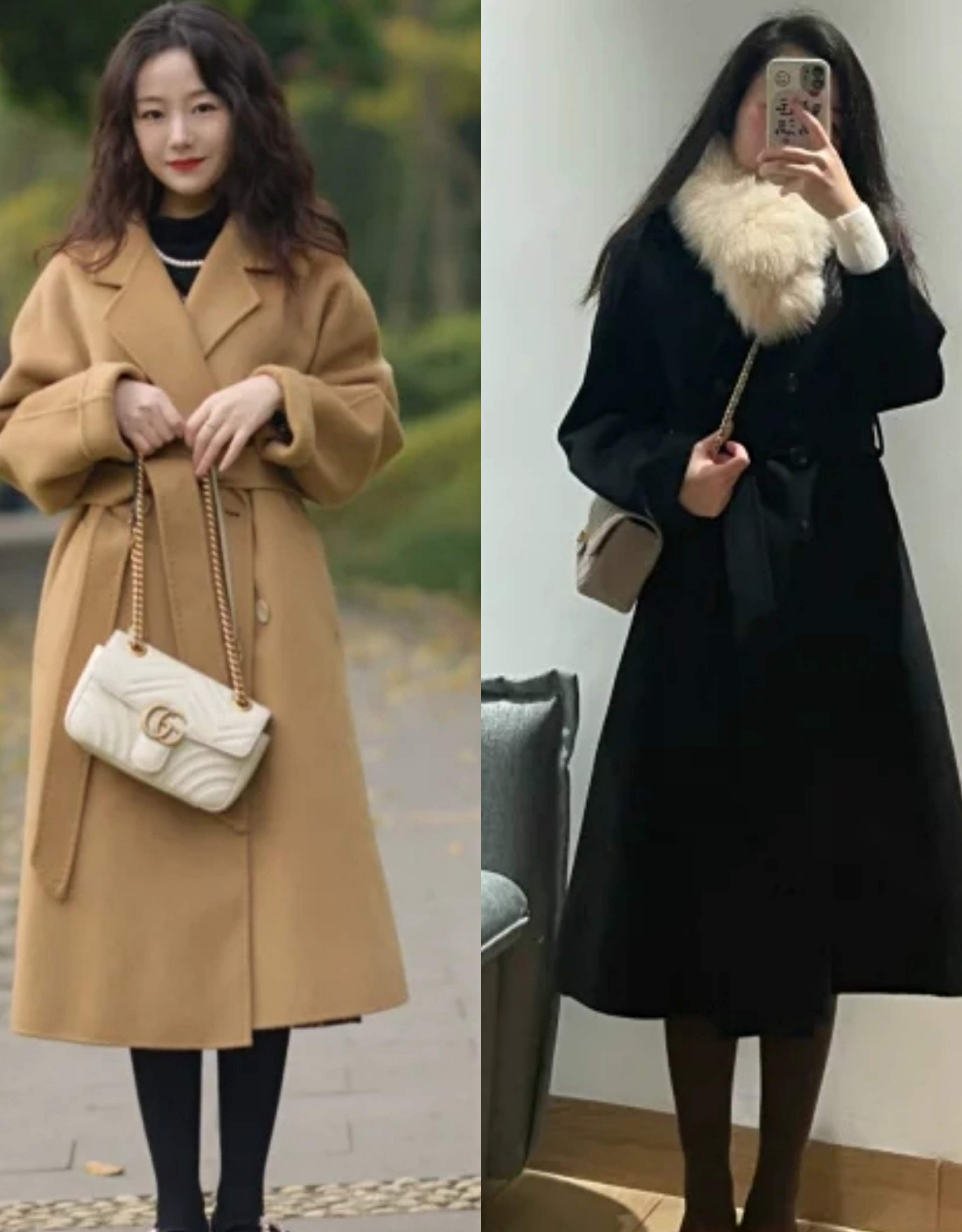 刚才已经提到了,收腰是为了让纵向线条更加纤细明显,需要注意的是穿大衣的时候,不要因为收腰而引起衣摆的膨胀。像左图收腰之后呈现出来的是H的线条,是有利于纵向显高的;而右图因为收腰引起大衣下摆膨胀感明显,大量感的衣摆拖累了身高、而且纵向的膨胀感妨碍了身材线条的修长效果实现。虽然都是收腰,但是并非都有显高的效果,这个是需要小个子特别注意的。