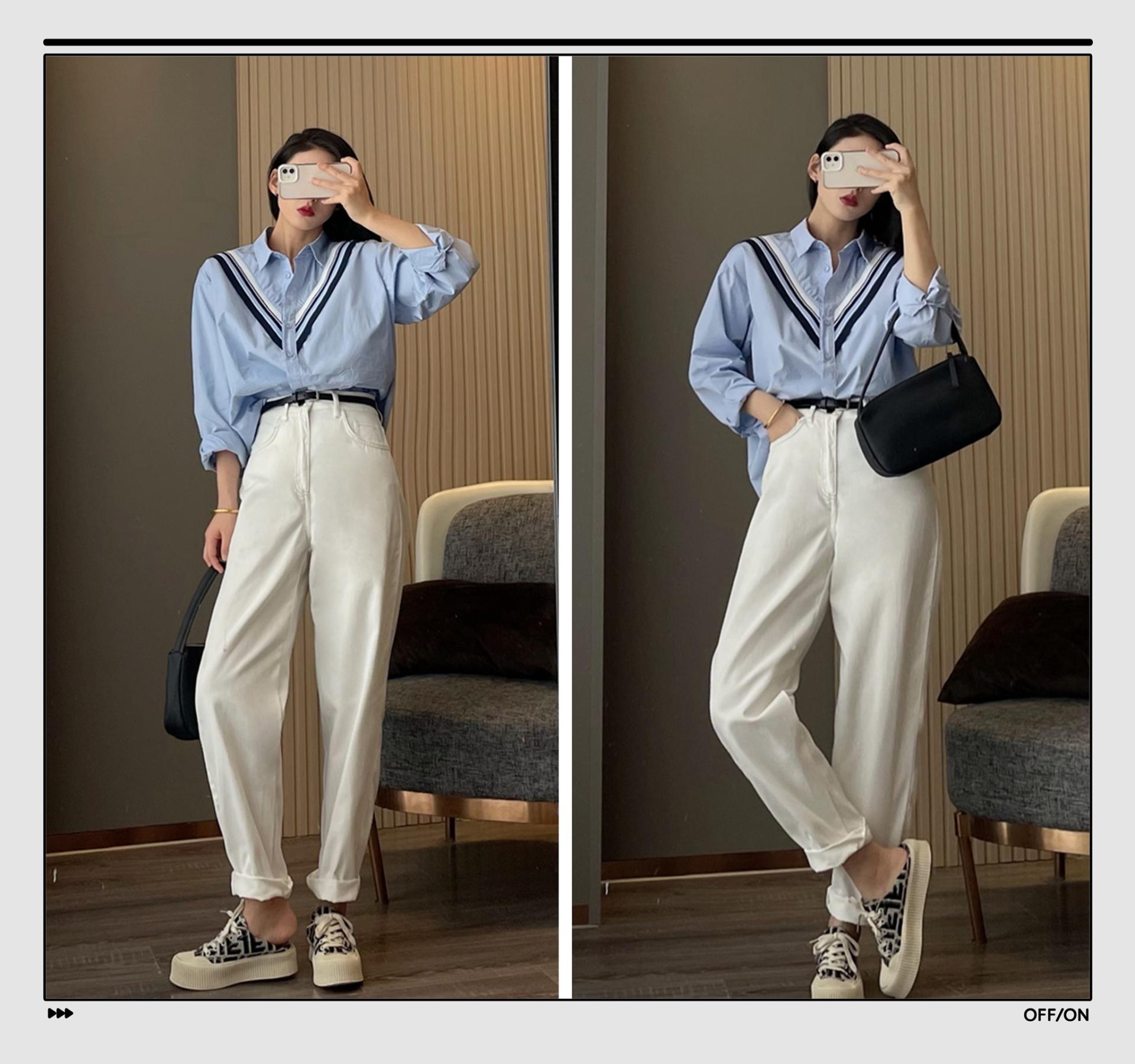 这件蓝色衬衫清新感扑面而来,简约又不失好看。最亮眼的就是V领撞色门襟,圆脸女孩必须要试一试。