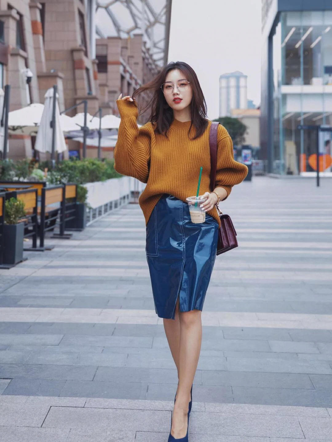蓝色的皮质半身裙真是太酷炫了,像这样的材质可以让造型更具有亮点,也更有质感。因为毛衣的垂感比较好,容易将我们的腰部曲线遮挡住,而这样的穿搭方法就能更好地秀出身材,看起来也特别有层次。