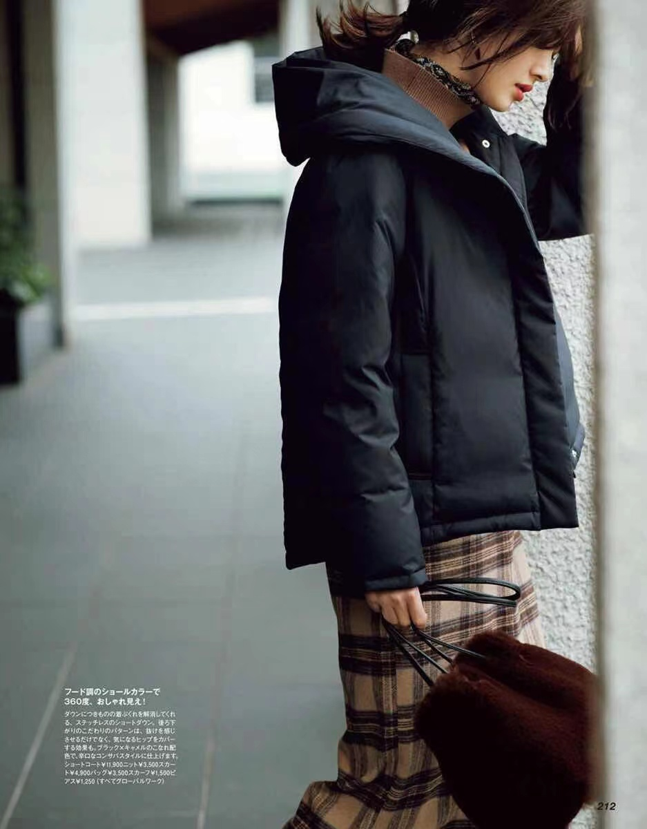 黑色的羽绒服搭配上格纹半身裙,展现出的风格依然很复古,这种棕色的格纹裙装穿在身上会让你的个人魅力大大的展现出来,和黑色的羽绒服也形成了对比。格纹的半身裙款式并不花哨,基础的配色更能增强高级感。