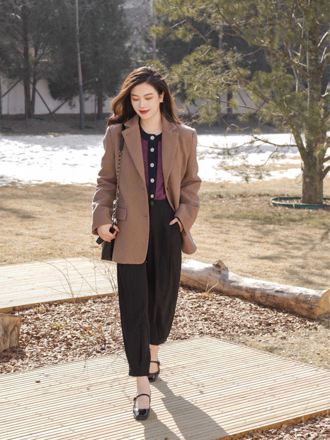 西装搭配上针织衫会很有气场,尤其是职场女性,可以尝试下面这种叠穿的搭配,一件驼色西装穿在身上,叠穿紫色的针织衫,层次感很强,也能用色彩之间相互混搭,展现出不一样的魅力。