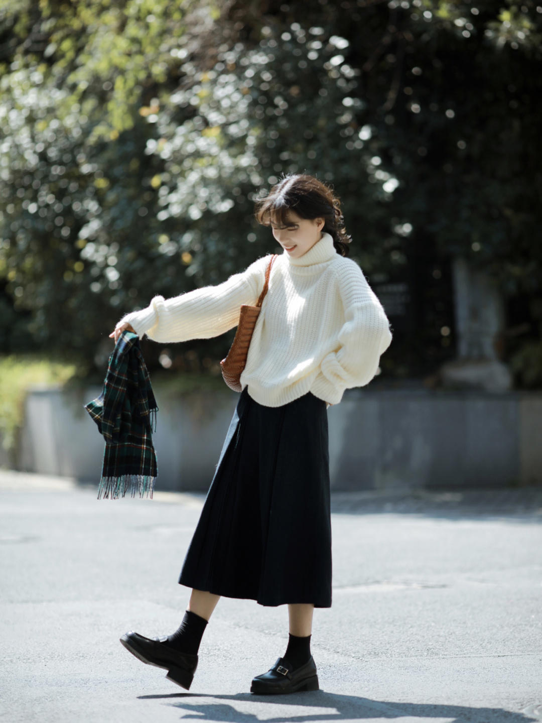 黑色小皮鞋搭配黑色短筒袜,能够与上半身的风格形成呼应。这样的鞋子穿在脚上特别舒服又很有质感,因为皮质面料看起来就比较高级。而且我们可以学习博主挑选融合了厚底设计的,起到增高效果。半身裙比较长,搭配上厚底小皮鞋,能够让身材看上去格外高挑。