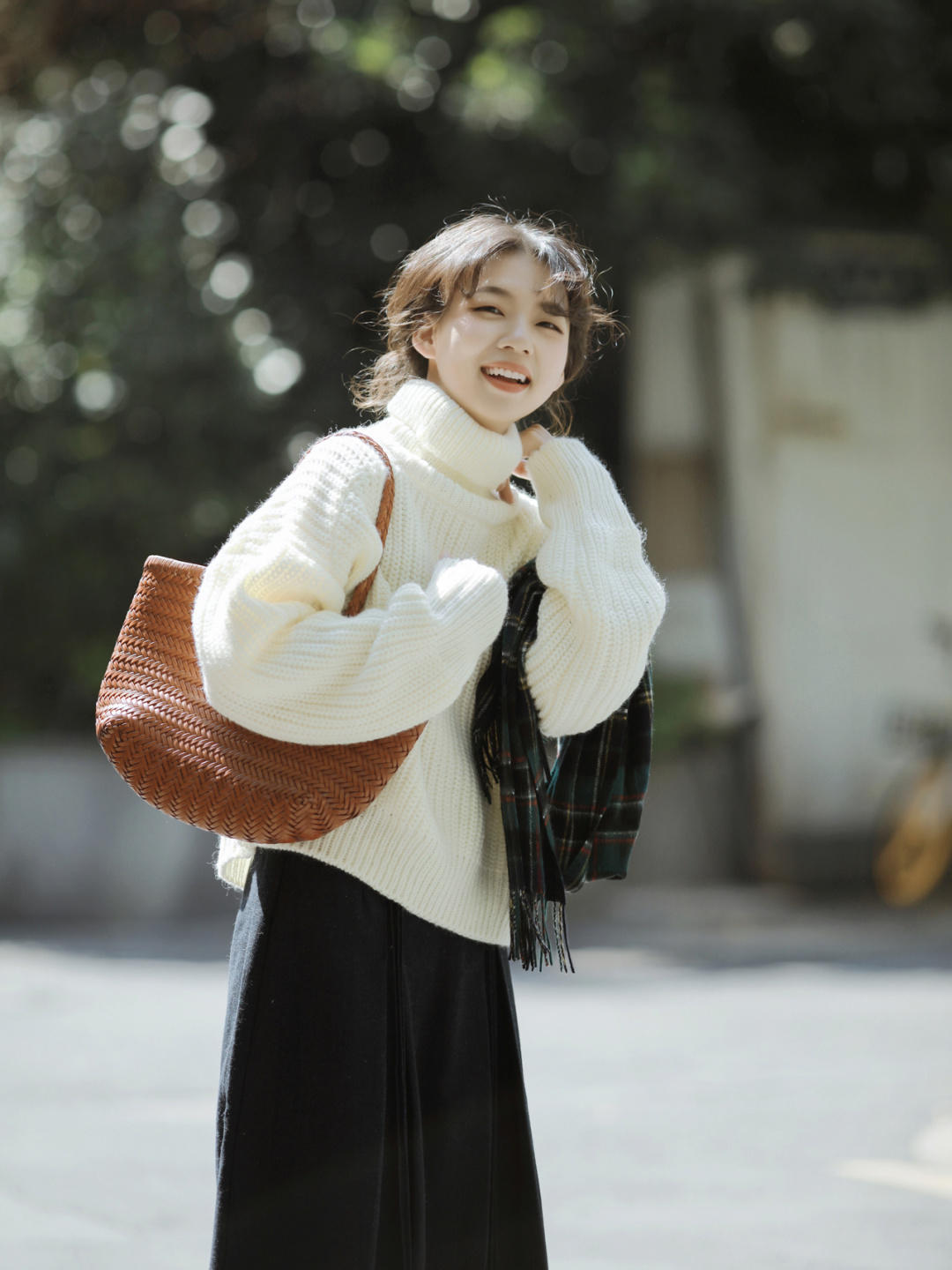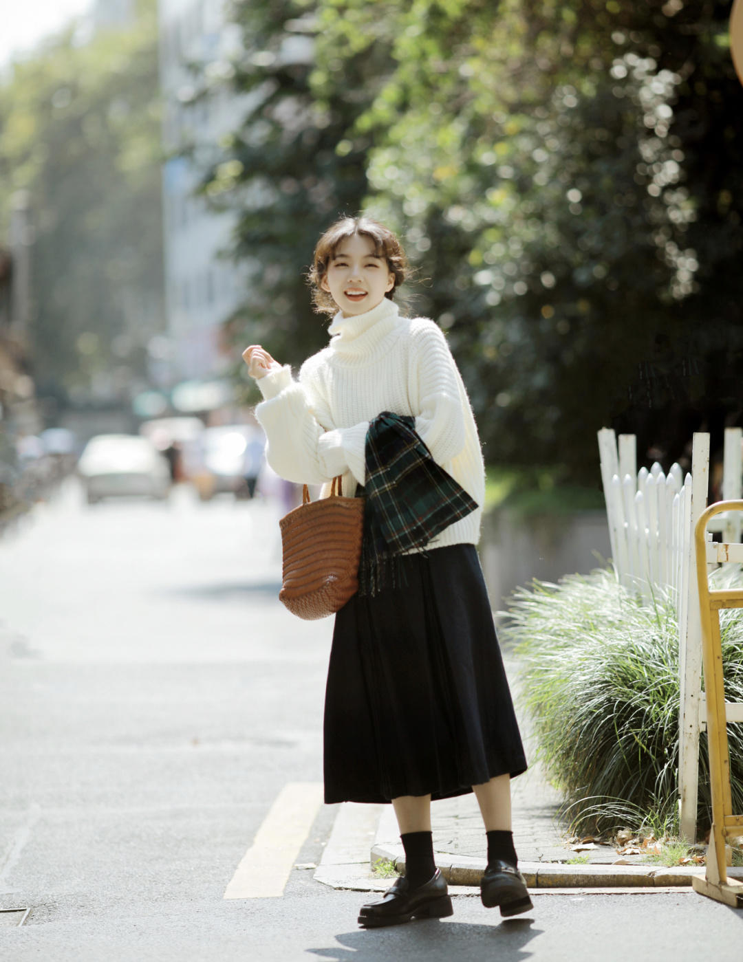 黑白搭配可以说是经典中的经典,所以博主在白色毛衣下面配上了一条黑色半身裙,很有学院风的感觉。如果我们对色彩不是很敏感,就可以搭配上黑色和白色。这两种颜色都是很经典的,踩雷的可能性非常小。