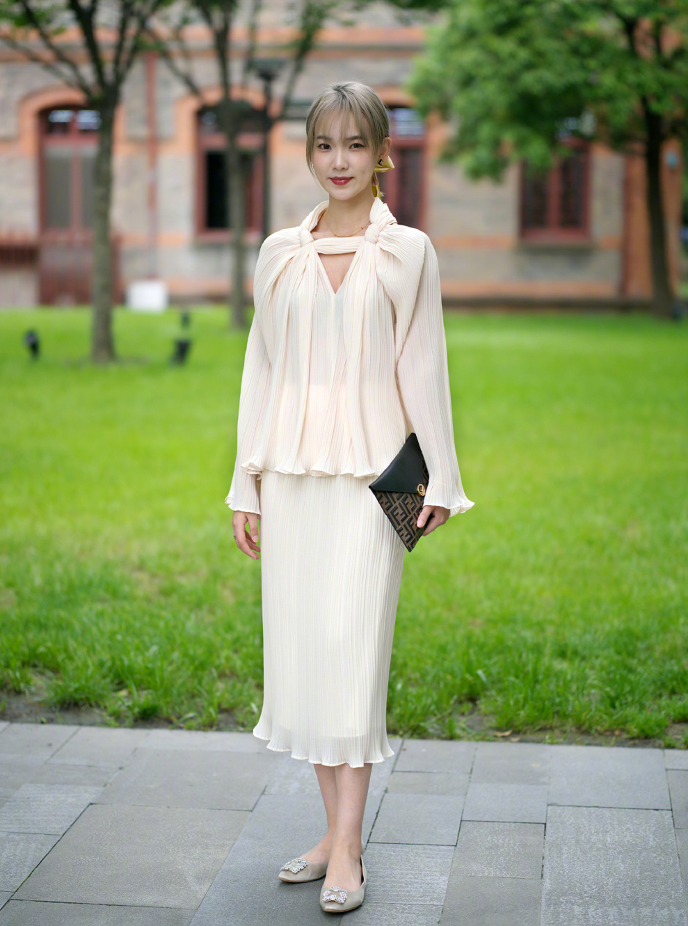 如果你对半身裙的搭配并不感冒,那不妨试试套装的穿法。套装在配色面料以及设计感上都达到了统一,能省去不少搭配的麻烦,同时还能塑造出高级感,对于30岁以上的女人来说,会更能凸显气质。像下图中的这种质感较为柔软一些的半身裙与上衣的搭配,就是很不错的选择。