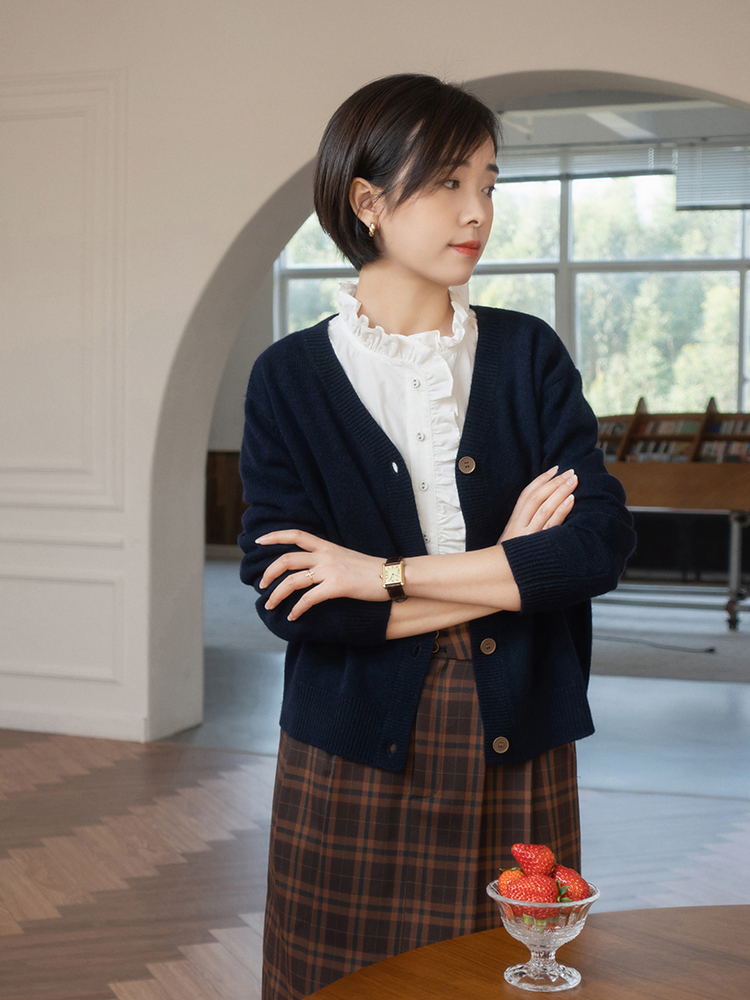 针织衫叠穿也很值得借鉴,除了单穿,你们可以在内搭融入一些时髦的衬衫,衬衫和针织衫的叠穿搭配可以进一步体现时尚感,比如下图的白衬衫和高腰半身裙形成呼应,可以分割你的比例,再结合简单的开衫叠穿一下,根本不会觉得老气。