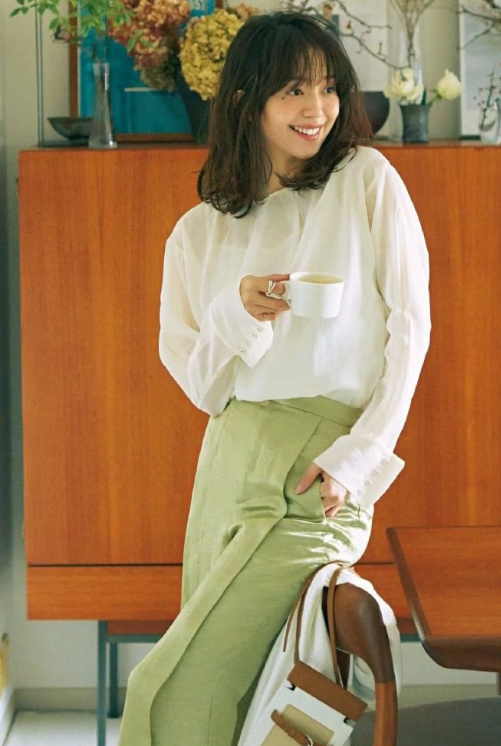 绿色的西装裤穿在身上显得轻盈又随性,这种浅绿色看上去还挺显白的,春天穿也刚刚好,不会觉得沉闷,和白色的雪纺衬衫融入起来更加灵动,根本不会觉得厚重。