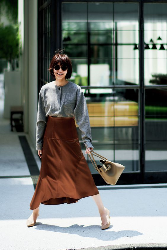 深色系的搭配,是很多人的选择,因为深色系看起来比较安全,不容易让搭配出现差错,搭配灰色的上衣和棕色的半身裙,结合一款高跟鞋,不仅可以打造性感,还可以让穿搭看起来更显气质。