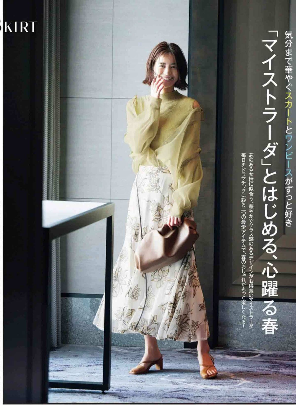 刚开始尝试印花半身裙的话,可以先从白色的类型入手,里面夹杂着其它色系的印花,突破其寡淡的风格,营造出更生动的风采。这位女士在上半身穿上了一款减龄的黄色针织衫,会比直接驾驭黑色单品减龄很多。