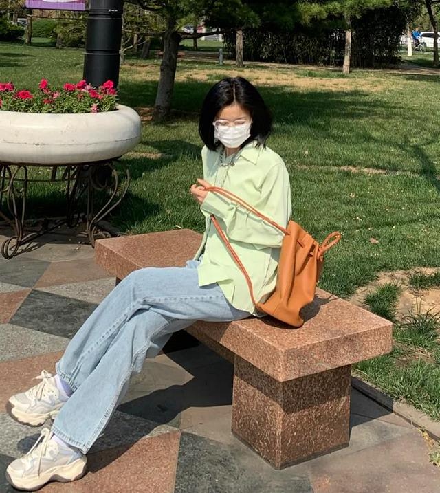 嫩绿色衬衫+牛仔直筒裤,脚下再加上一双老爹运动鞋,如何休闲舒适又好看的装扮,无论是上班通勤,还是出行都妥妥的。