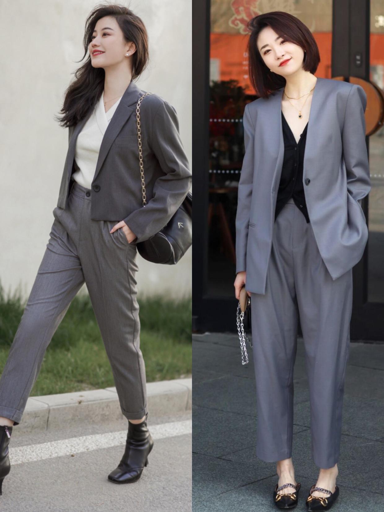 大家可以结合自身的喜好来挑选西装的款式,配色对于整体的影响很大,黑白色是基础,不管什么年纪都能穿,如果是追求高质感的时髦女人,那就入手灰色西装套装,它会把你的肤色映衬的更白皙,还不会显得沉闷单调,是适中的颜色,日常、上班穿都没什么问题。
