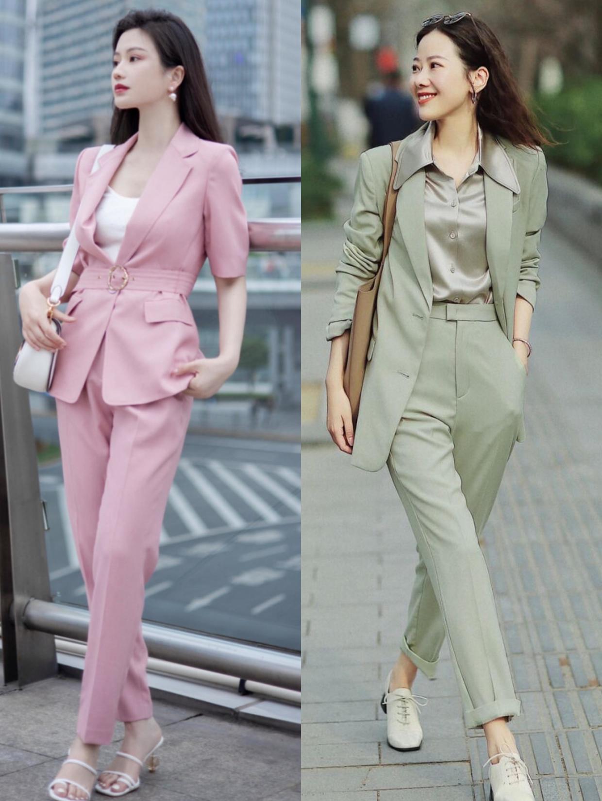 如果你对时尚有一定的追求,或者对自己很自信的话,就入手色彩鲜艳些的西装套装吧,粉色套装很适合肤色白皙的美眉,看起来娇俏粉嫩,会让你减龄10岁不止。莫兰迪绿则是百搭不挑皮的颜色,能轻松塑造出高级感,有了它的映衬,打造“冷白皮”也不是问题。